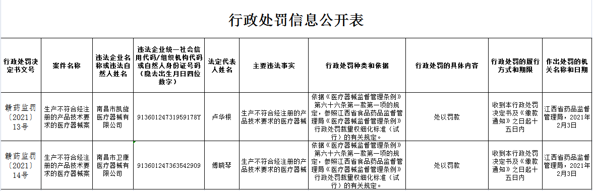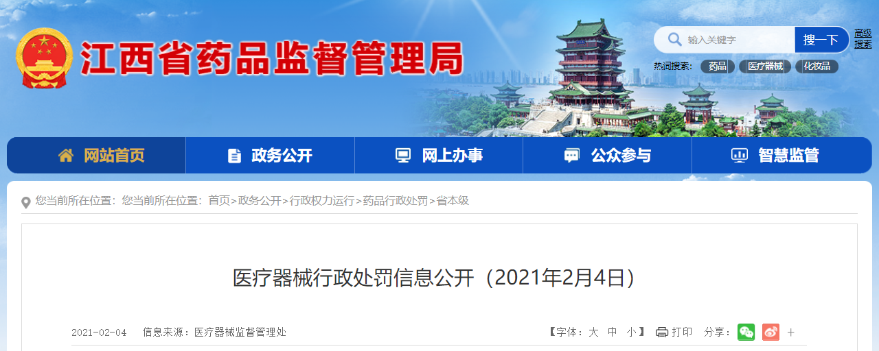 中國(guó)質(zhì)量新聞網(wǎng)訊 2021年2月4日,江西省藥品監(jiān)督管理局網(wǎng)站發(fā)布醫(yī)療器械行政處罰信息(2021年2月4日)。