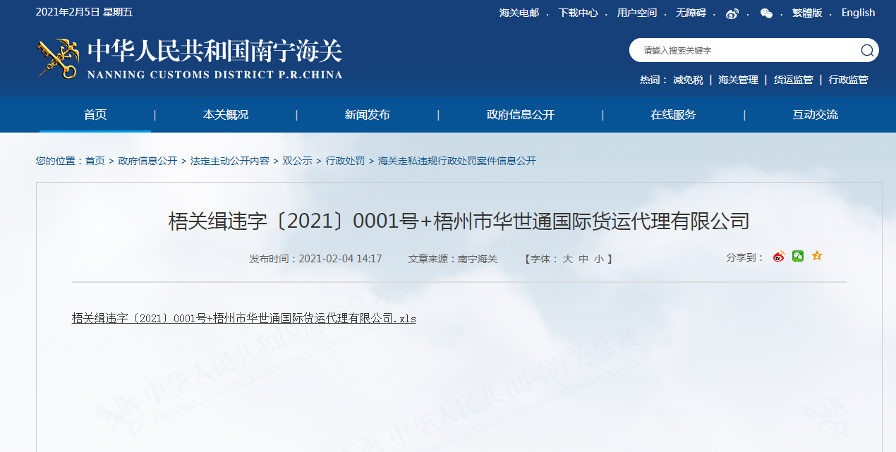 中國(guó)質(zhì)量新聞網(wǎng)訊(閆冬)2月4日,南寧海關(guān)公布一則行政處罰決定書。梧州市華世通國(guó)際貨運(yùn)代理有限公司(以下簡(jiǎn)稱:梧州華世通)因違反海關(guān)監(jiān)管規(guī)定,被梧州海關(guān)處罰。