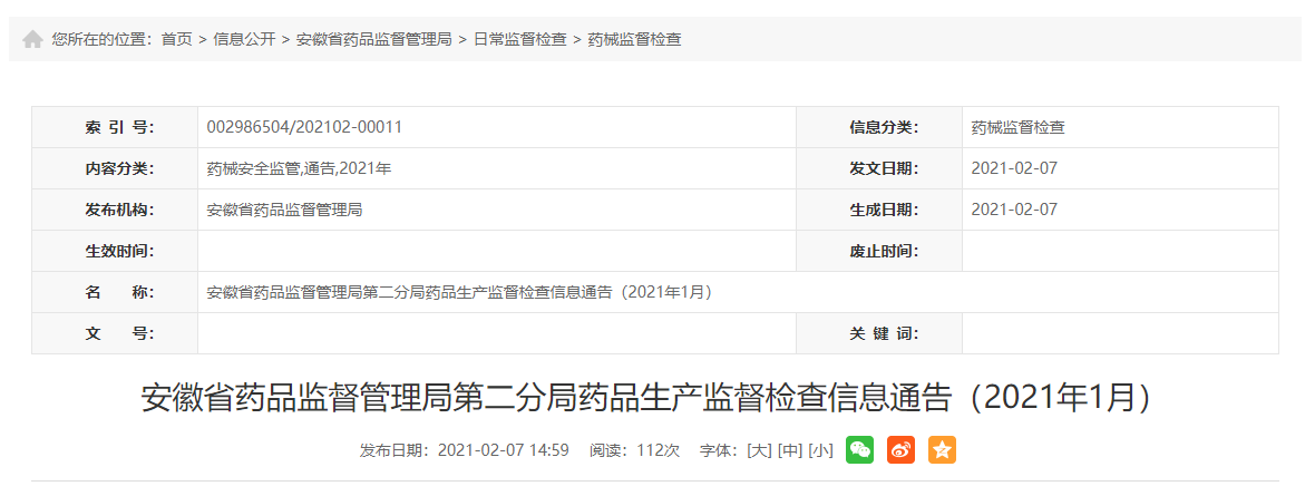 安徽省藥品監(jiān)督管理局第二分局藥品生產(chǎn)監(jiān)督檢查信息通告(2021年1月)