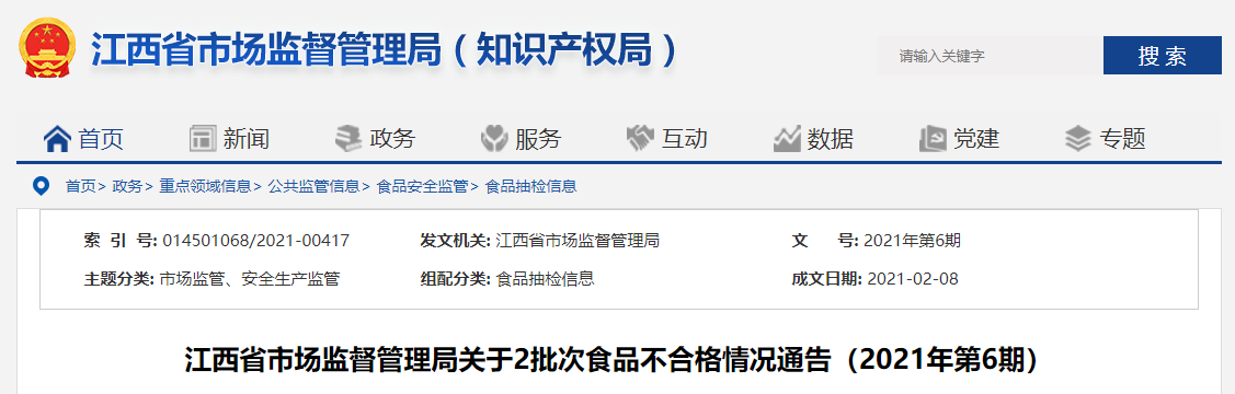 中國(guó)質(zhì)量新聞網(wǎng)訊 2021年2月8日,江西省市場(chǎng)監(jiān)督管理局網(wǎng)站發(fā)布關(guān)于2批次食品不合格情況通告(2021年第6期)。通告稱,近期,江西省市場(chǎng)監(jiān)督管理局組織食品安全監(jiān)督抽檢食用農(nóng)產(chǎn)品、糧食加工品、餐飲食品3大類食品共146批次食品,發(fā)現(xiàn)2批次不合格,涉及農(nóng)獸藥殘留和微生物污染問題。