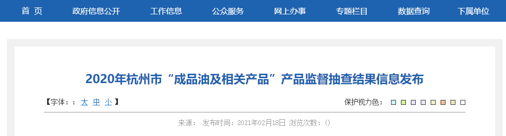 中國(guó)質(zhì)量新聞網(wǎng)訊 2021年2月18日,杭州市市場(chǎng)監(jiān)督管理局網(wǎng)站公布2020年杭州市“成品油及相關(guān)產(chǎn)品”產(chǎn)品監(jiān)督抽查結(jié)果。