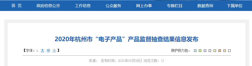 中國質量新聞網訊 2021年2月18日,杭州市市場監(jiān)督管理局網站公布2020年杭州市“電子產品”產品監(jiān)督抽查結果信息。