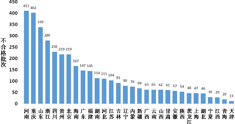 圖3 各省市場銷售食用農(nóng)產(chǎn)品抽檢不合格數(shù)量分布