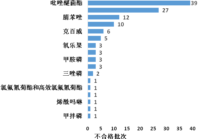 吡唑醚菌酯、丙溴磷、腈苯唑等農(nóng)藥殘留超標為水果產(chǎn)品抽檢主要不合格項。吡唑醚菌酯殘留超標39批次,主要從香蕉中檢出;丙溴磷殘留超標27批次,主要從柑、橘類中檢出;腈苯唑殘留超標12批次,主要從香蕉中檢出。此外,香蕉類和柑、橘類水果產(chǎn)品檢出農(nóng)藥殘留超標批次最多(詳見圖14)。