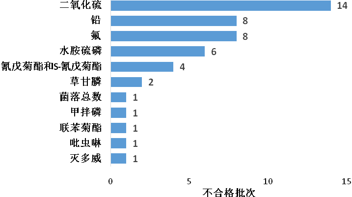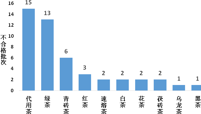 二氧化硫、鉛和氟等為茶葉及相關制品抽檢主要不合格項。二氧化硫檢出14批次,主要從代用茶中檢出,如甘草片、枸杞;鉛檢出8批次,主要從綠茶、代用茶中檢出;氟檢出8批次,主要從青磚茶、茯磚茶中檢出(詳見圖18)。