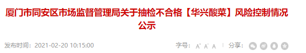 廈門市同安區(qū)市場監(jiān)督管理局關(guān)于抽檢不合格【華興酸菜】風(fēng)險(xiǎn)控制情況公示