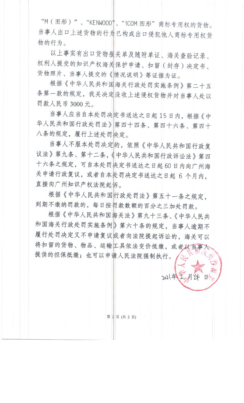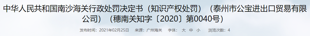 中華人民共和國(guó)南沙海關(guān)行政處罰決定書(shū)(知識(shí)產(chǎn)權(quán)處罰)(泰州市公寶進(jìn)出口貿(mào)易有限公司)(穗南關(guān)知字〔2020〕第0040號(hào))