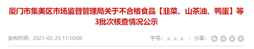 廈門市集美區(qū)市場監(jiān)督管理局關(guān)于不合格食品【韭菜、山茶油、鴨蛋】等3批次核查情況公示