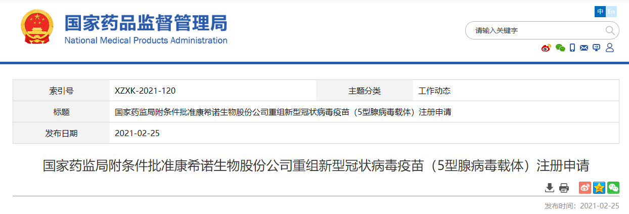 2月25日,國家藥品監(jiān)督管理局附條件批準康希諾生物股份公司重組新型冠狀病毒疫苗(5型腺病毒載體)注冊申請。該疫苗是首家獲批的國產腺病毒載體新冠病毒疫苗,適用于預防由新型冠狀病毒感染引起的疾?。–OVID-19)。