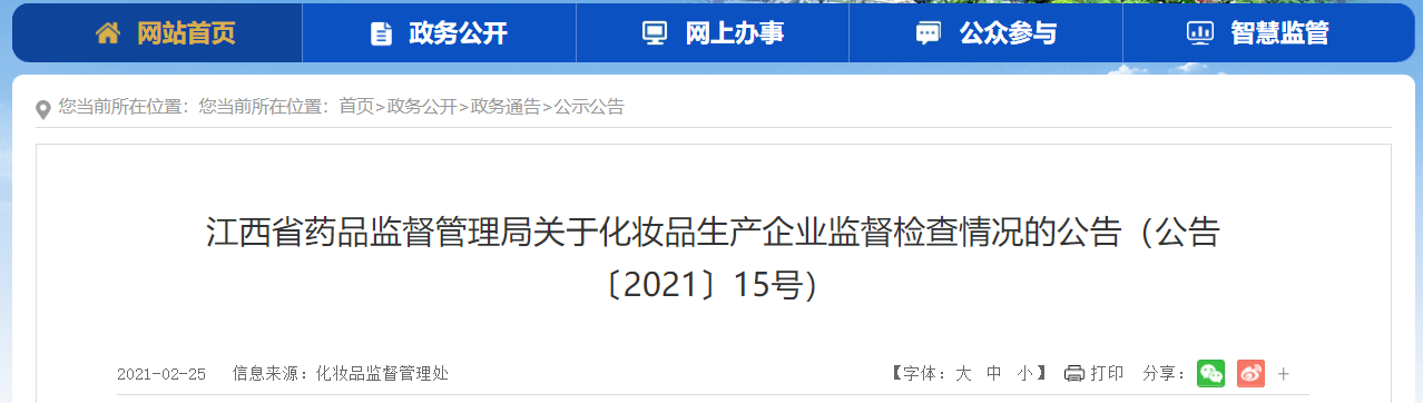 江西省藥品監(jiān)督管理局關(guān)于化妝品生產(chǎn)企業(yè)監(jiān)督檢查情況的公告(公告〔2021〕15號)