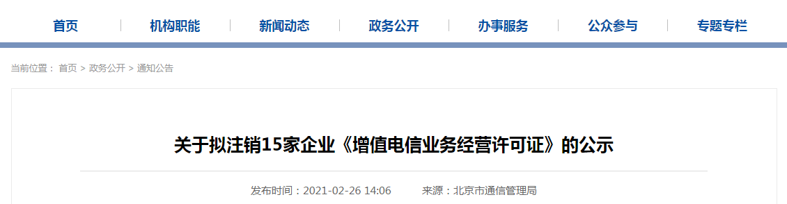中國質(zhì)量新聞網(wǎng)訊 近日,北京市通信管理局網(wǎng)站發(fā)布關(guān)于擬注銷15家企業(yè)《增值電信業(yè)務(wù)經(jīng)營許可證》的公示。北京辰設(shè)聚成科技有限公司等15家企業(yè)向該局申請終止在北京地區(qū)經(jīng)營增值電信業(yè)務(wù)。為維護(hù)電信用戶合法權(quán)益,妥善解決用戶善后問題,依據(jù)《電信業(yè)務(wù)經(jīng)營許可管理辦法》(工業(yè)和信息化部令第42號)規(guī)定,現(xiàn)公示擬注銷《增值電信業(yè)務(wù)經(jīng)營許可證》的相關(guān)信息,公示期為自公示之日起三十日。