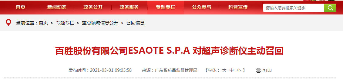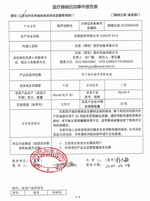 百勝股份有限公司ESAOTE S.P.A代理人百勝(深圳)醫(yī)療設(shè)備有限公司報(bào)告,因接到磁場(chǎng)發(fā)生器供應(yīng)商的報(bào)告稱,某個(gè)特定時(shí)間段內(nèi)生產(chǎn)的該部件用于3D導(dǎo)航來實(shí)現(xiàn)融合成像、虛擬導(dǎo)航和虛擬穿刺功能時(shí),可能出現(xiàn)測(cè)量精準(zhǔn)度不足,進(jìn)而影響成像或皮下穿刺術(shù)引導(dǎo)的準(zhǔn)確性。百勝股份有限公司ESAOTE S.P.A對(duì)其生產(chǎn)的超聲診斷儀主動(dòng)召回。召回級(jí)別為二級(jí)。涉及產(chǎn)品的型號(hào)、規(guī)格及批次等詳細(xì)信息見《醫(yī)療器械召回事件報(bào)告表》。