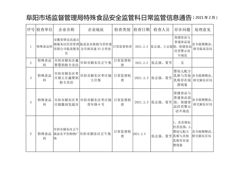 阜陽(yáng)市市場(chǎng)監(jiān)督管理局特殊食品安全監(jiān)管科日常監(jiān)管信息通告(2021年2月)
