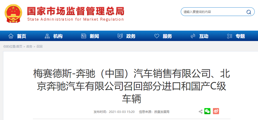 梅賽德斯-奔馳(中國)汽車銷售有限公司、北京奔馳汽車有限公司召回部分進口和國產(chǎn)C級車輛