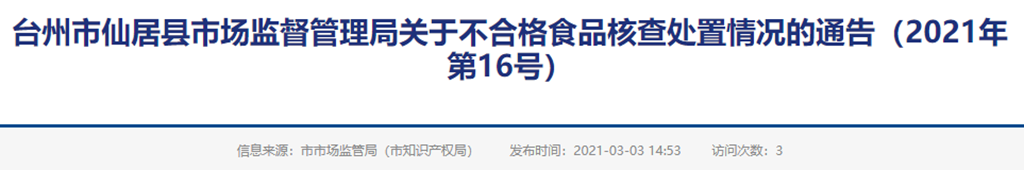 臺州市仙居縣市場監(jiān)督管理局關于不合格食品核查處置情況的通告(2021年第16號)