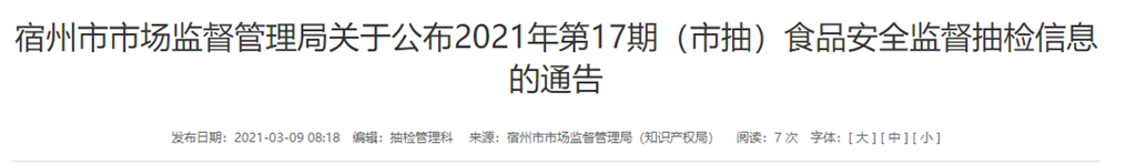 中國質(zhì)量新聞網(wǎng)訊 安徽省宿州市市場監(jiān)督管理局網(wǎng)站3月9日刊登關(guān)于公布2021年第17期(市抽)食品安全監(jiān)督抽檢信息的通告。