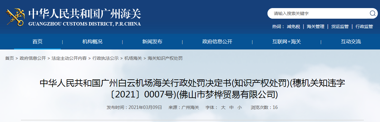 中國(guó)質(zhì)量新聞網(wǎng)訊 近日,廣州白云機(jī)場(chǎng)海關(guān)發(fā)布行政處罰決定書(shū)(知識(shí)產(chǎn)權(quán)處罰),涉及佛山市夢(mèng)樺貿(mào)易有限公司。