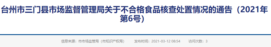 臺(tái)州市三門縣市場監(jiān)督管理局關(guān)于不合格食品核查處置情況的通告(2021年第6號(hào))