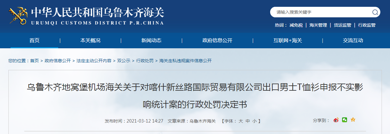 中國質(zhì)量新聞網(wǎng)訊 近日,烏魯木齊地窩堡機場海關(guān)發(fā)布關(guān)于對喀什新絲路國際貿(mào)易有限公司出口男士T恤衫申報不實影響統(tǒng)計案的行政處罰決定書。
