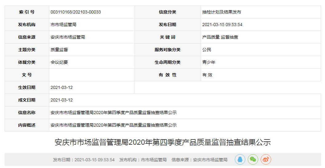 中國(guó)質(zhì)量新聞網(wǎng)訊 2021年3月15日,安徽省安慶市市場(chǎng)監(jiān)督管理局公示2020年第四季度產(chǎn)品質(zhì)量監(jiān)督抽查結(jié)果。
