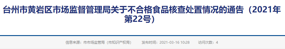 臺(tái)州市黃巖區(qū)市場(chǎng)監(jiān)督管理局關(guān)于不合格食品核查處置情況的通告(2021年第22號(hào))