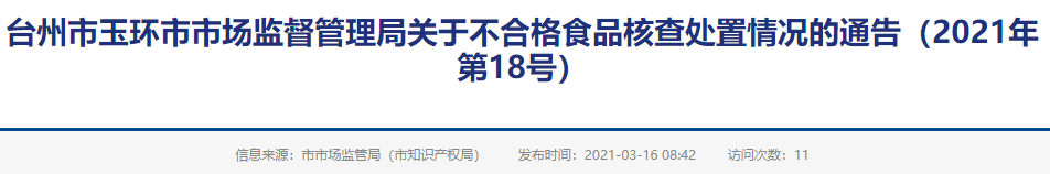 臺(tái)州市玉環(huán)市市場監(jiān)督管理局關(guān)于不合格食品核查處置情況的通告(2021年第18號(hào))