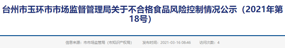 臺(tái)州市玉環(huán)市市場(chǎng)監(jiān)督管理局關(guān)于不合格食品風(fēng)險(xiǎn)控制情況公示(2021年第18號(hào))
