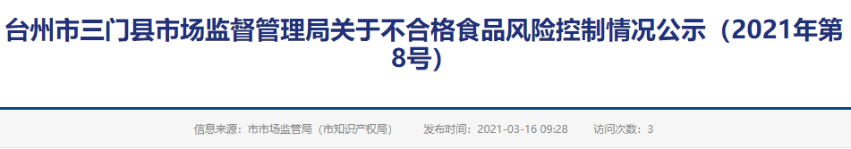 臺(tái)州市三門縣市場監(jiān)督管理局關(guān)于不合格食品風(fēng)險(xiǎn)控制情況公示(2021年第8號(hào))
