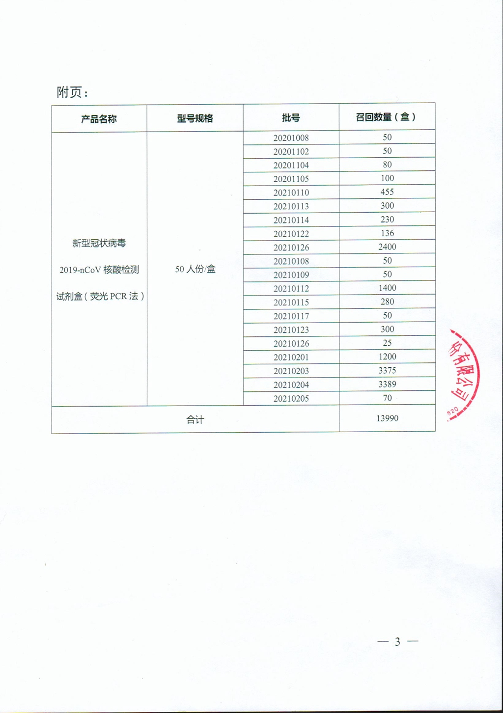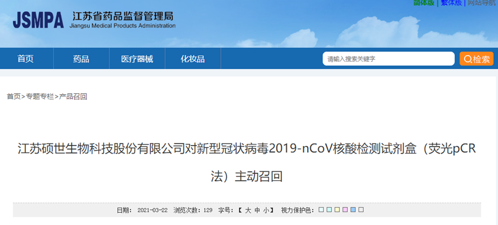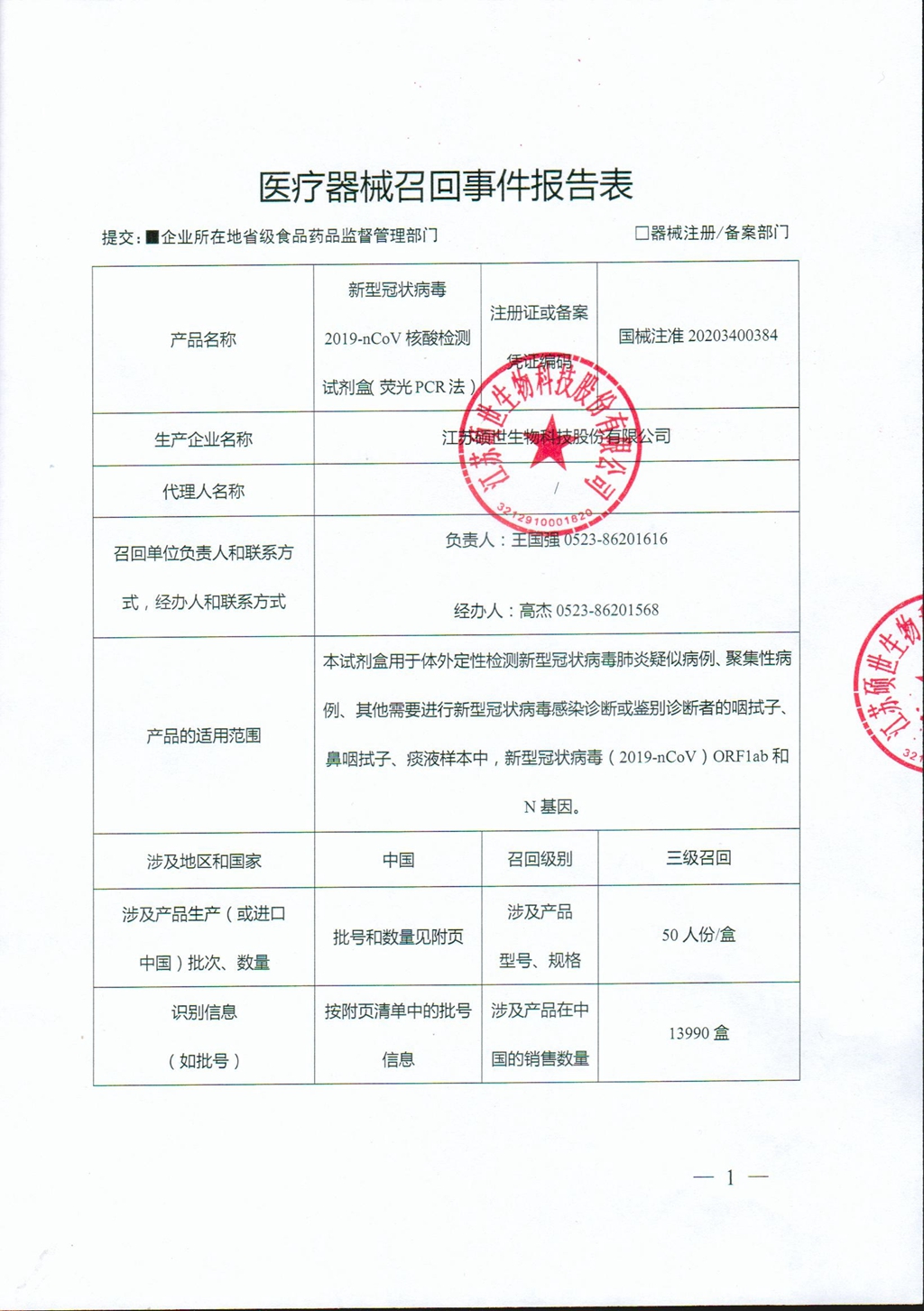 江蘇碩世生物科技股份有限公司對新型冠狀病毒2019-nCoV核酸檢測試劑盒(熒光pCR法)主動召回