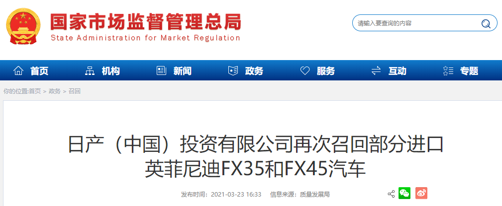 日產(chǎn)(中國)投資有限公司再次召回部分進口英菲尼迪FX35和FX45汽車