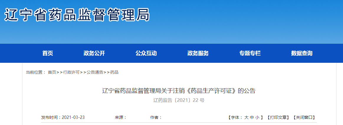 遼寧省藥品監(jiān)督管理局關(guān)于注銷《藥品生產(chǎn)許可證》的公告