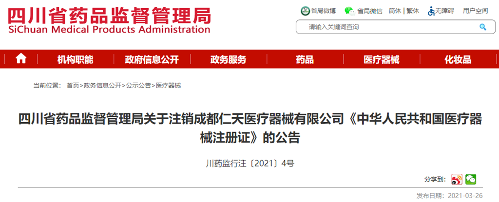 四川省藥品監(jiān)督管理局關(guān)于注銷成都仁天醫(yī)療器械有限公司《中華人民共和國醫(yī)療器械注冊證》的公告