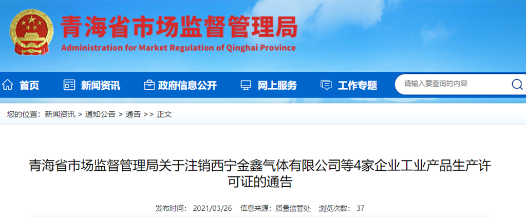 青海省市場(chǎng)監(jiān)督管理局關(guān)于注銷西寧金鑫氣體有限公司等4家企業(yè)工業(yè)產(chǎn)品生產(chǎn)許可證的通告