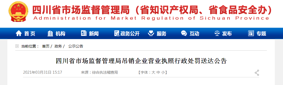 中國(guó)質(zhì)量新聞網(wǎng)訊 2021年3月31日,四川省市場(chǎng)監(jiān)督管理局網(wǎng)站發(fā)布了四川省市場(chǎng)監(jiān)督管理局吊銷企業(yè)營(yíng)業(yè)執(zhí)照行政處罰送達(dá)公告。原文如下: