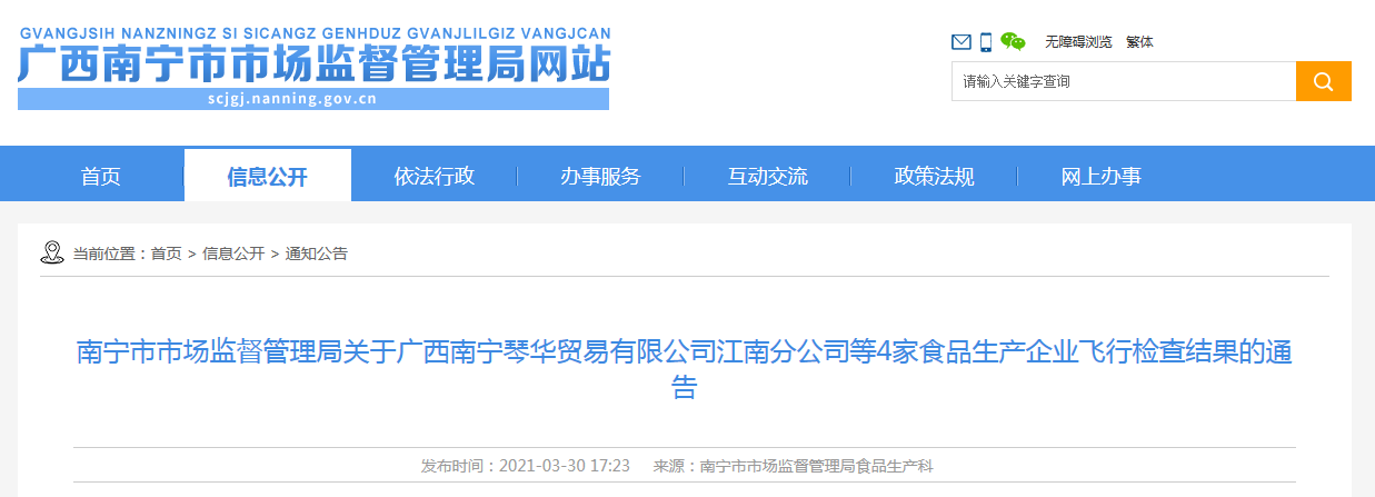 中國質(zhì)量新聞網(wǎng)訊 3月30日,南寧市市場監(jiān)督管理局網(wǎng)站發(fā)布關(guān)于廣西南寧琴華貿(mào)易有限公司江南分公司等4家食品生產(chǎn)企業(yè)飛行檢查結(jié)果的通告。本次檢查內(nèi)容包括企業(yè)基本情況、企業(yè)落實主體責任情況、接受檢查情況等3大類12項內(nèi)容,涉及廣西南寧琴華貿(mào)易有限公司江南分公司、南寧市全福食品有限公司、賓陽縣寶通米粉加工廠、賓陽縣西街四哥米粉加工廠。