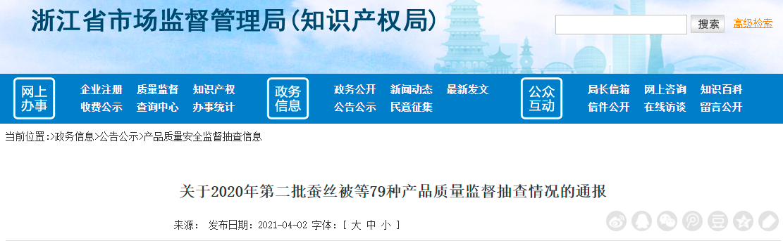 中國質(zhì)量新聞網(wǎng)訊 2021年4月2日,浙江省市場監(jiān)督管理局發(fā)布了2020年第二批蠶絲被等79種產(chǎn)品質(zhì)量監(jiān)督抽查情況的通報(bào)。