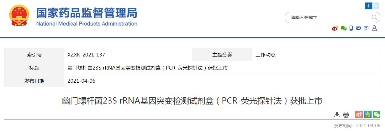 該產(chǎn)品是國內(nèi)上市的首個(gè)幽門螺桿菌23S rRNA基因突變檢測(cè)試劑盒,用于幽門螺桿菌克拉霉素耐藥的臨床輔助診斷,為臨床醫(yī)生評(píng)估個(gè)體中幽門螺桿菌的耐藥特性提供參考。