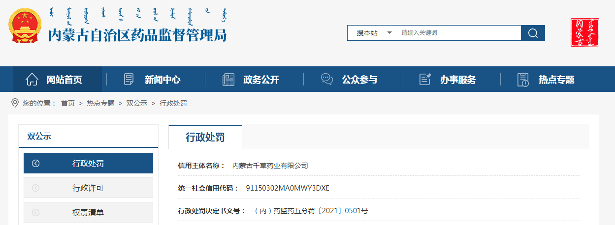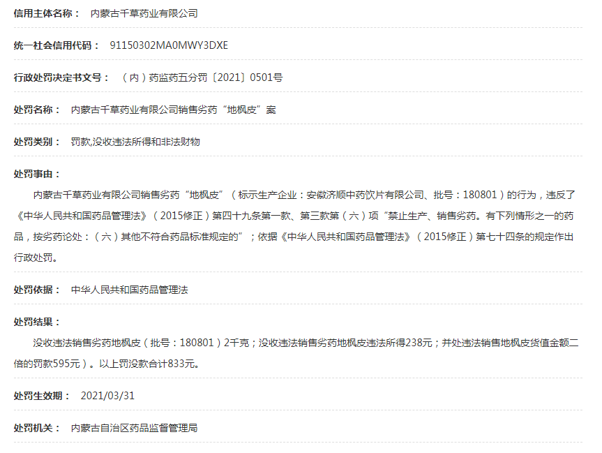中國質(zhì)量新聞網(wǎng)訊 近日,內(nèi)蒙古自治區(qū)藥品監(jiān)督管理局發(fā)布行政處罰信息,涉及內(nèi)蒙古千草藥業(yè)有限公司銷售劣藥“地楓皮”案。