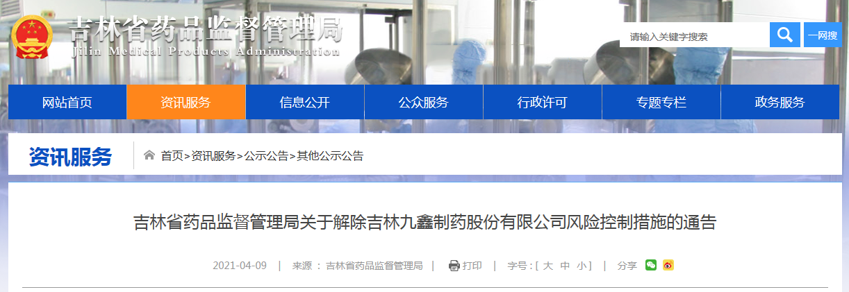 中國質量新聞網訊 4月9日,吉林省藥品監(jiān)督管理局網站發(fā)布關于解除吉林九鑫制藥股份有限公司風險控制措施的通告。