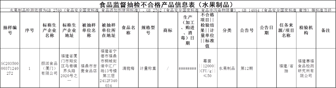 標稱顏派食品(廈門)有限公司2020年10月12日生產(chǎn)的清脆梅,霉菌不合格,銷售單位為福鼎市吉菱食品店,檢驗機構為福建賽福食品檢測研究所有限公司。