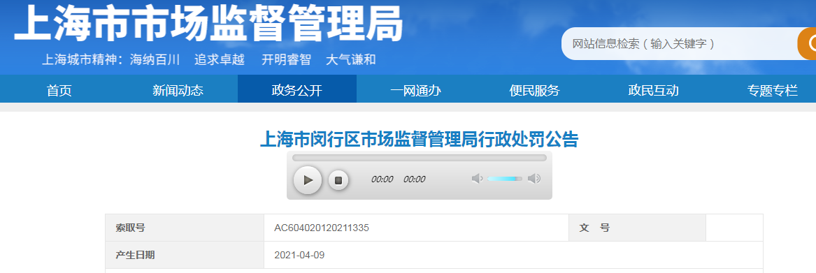 中國質量新聞網訊 2021年4月9日,上海市市場監(jiān)督管理局網站發(fā)布了上海市閔行區(qū)市場監(jiān)督管理局行政處罰公告。