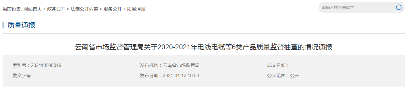 中國(guó)質(zhì)量新聞網(wǎng)訊 2021年4月12日,云南省市場(chǎng)監(jiān)督管理局網(wǎng)站發(fā)布了關(guān)于2020-2021年電線電纜等6類產(chǎn)品質(zhì)量監(jiān)督抽查的情況通報(bào)。