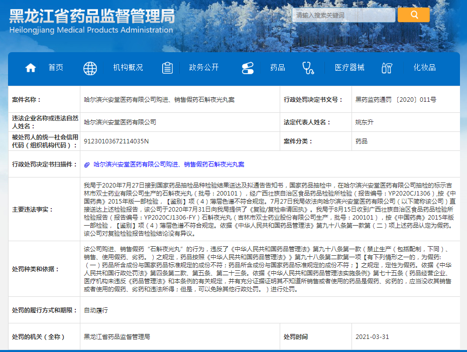 中國質(zhì)量新聞網(wǎng)訊 近日,黑龍江省藥品監(jiān)督管理局網(wǎng)站公布了對哈爾濱興安堂醫(yī)藥有限公司購進、銷售假藥石斛夜光丸案的行政處罰決定書(黑藥監(jiān)藥通罰〔2020〕011號)。內(nèi)容如下: