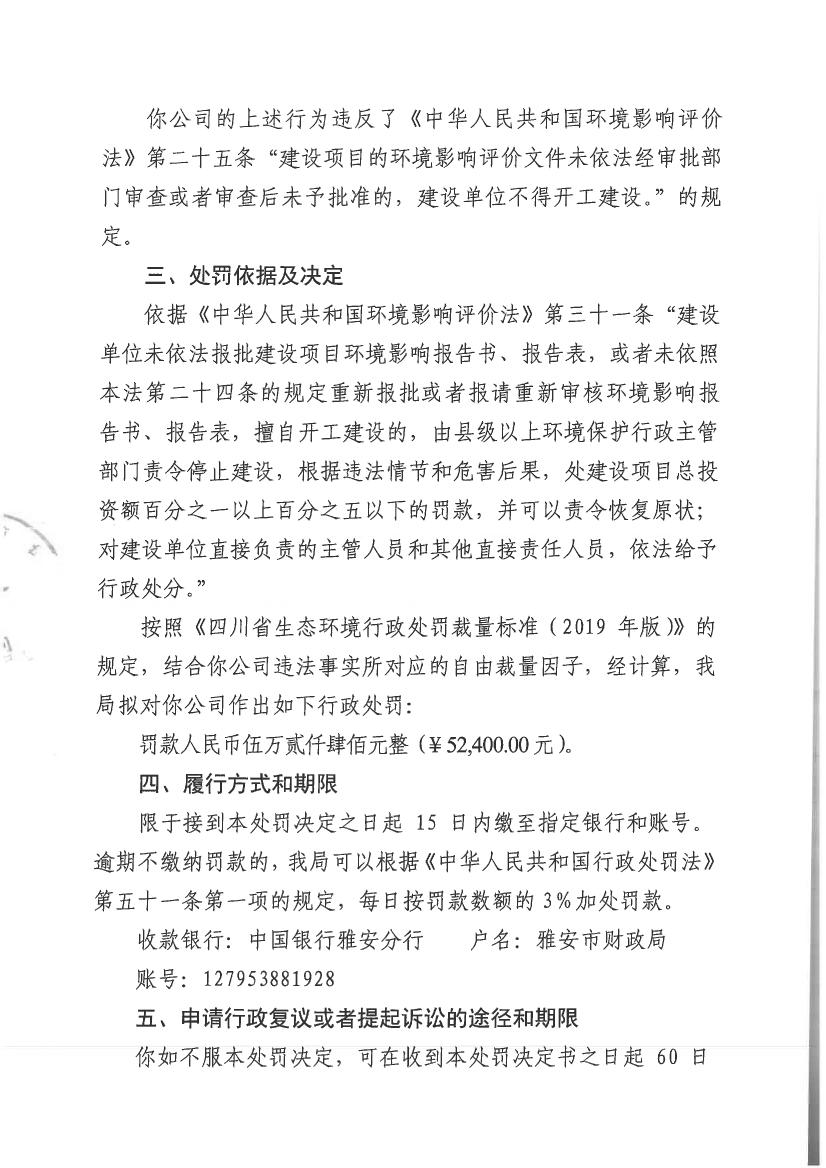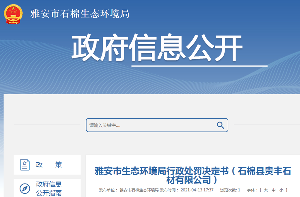 中國質(zhì)量新聞網(wǎng)訊 四川省雅安市石棉生態(tài)環(huán)境局網(wǎng)站4月13日發(fā)布雅安市生態(tài)環(huán)境局行政處罰決定書(石棉縣貴豐石材有限公司)。具體詳情如下: