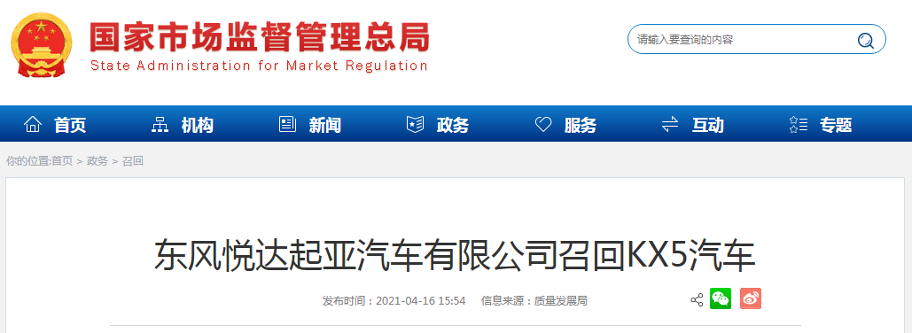 中國質量新聞網(wǎng)訊 據(jù)市場監(jiān)管總局網(wǎng)站4月16日消息,日前,東風悅達起亞汽車有限公司根據(jù)《缺陷汽車產(chǎn)品召回管理條例》和《缺陷汽車產(chǎn)品召回管理條例實施辦法》的要求,向國家市場監(jiān)督管理總局備案了召回計劃,決定自2021年6月15日起,召回2016年1月26日至2018年12月8日期間生產(chǎn)的的KX5汽車,共計89431輛。