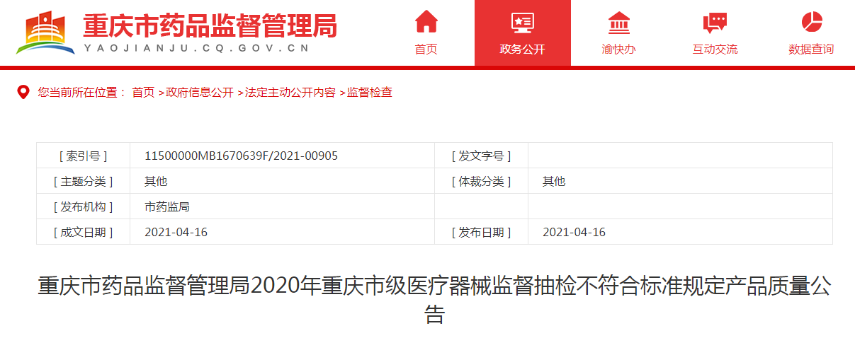 中國質量新聞網(wǎng)訊 近日,重慶市藥品監(jiān)督管理局發(fā)布了2020年重慶市級醫(yī)療器械監(jiān)督抽檢不符合標準規(guī)定產(chǎn)品質量公告。據(jù)公告,重慶市藥品監(jiān)督管理局已完成2020年市級醫(yī)療器械監(jiān)督抽檢工作,共45批(臺)產(chǎn)品不符合標準規(guī)定。