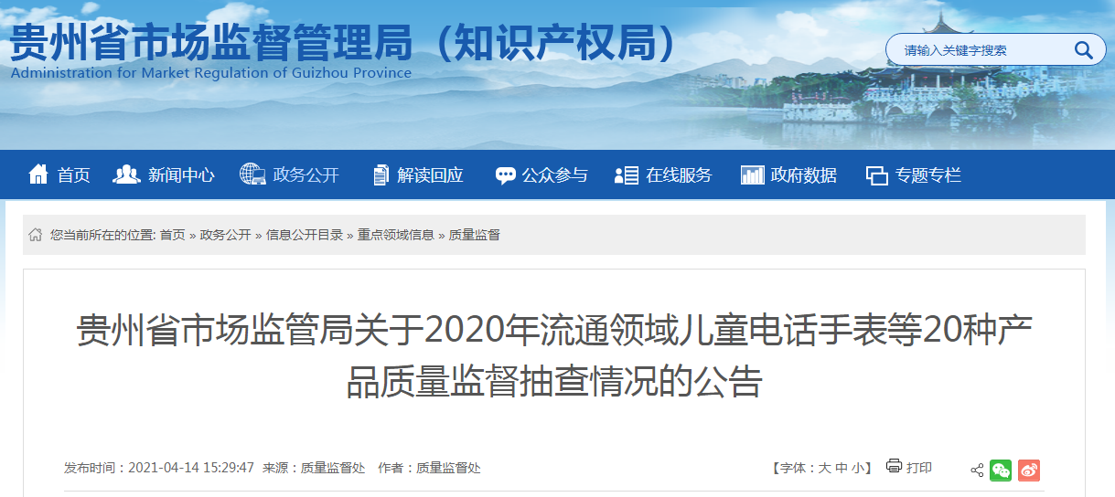 中國(guó)質(zhì)量新聞網(wǎng)訊 近日,貴州省市場(chǎng)監(jiān)管局發(fā)布了2020年流通領(lǐng)域兒童電話手表等20種產(chǎn)品質(zhì)量監(jiān)督抽查情況的公告。