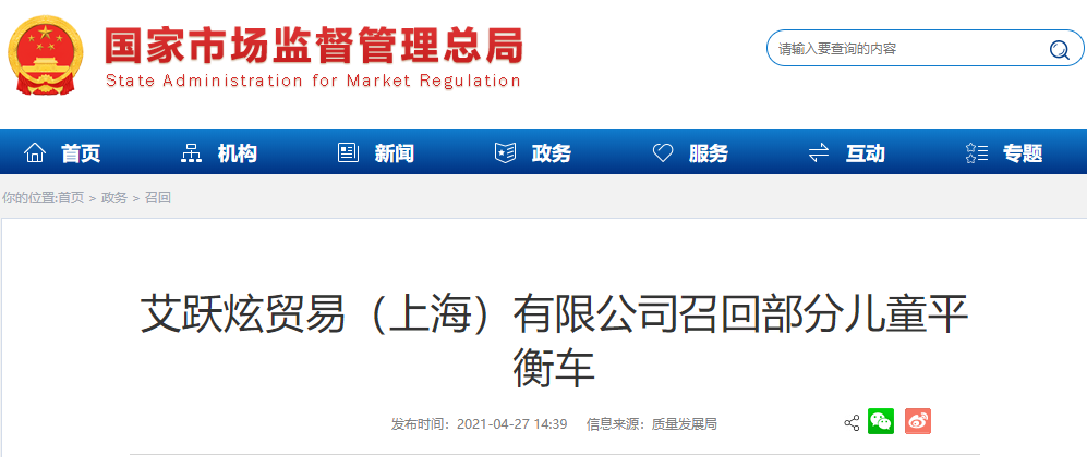 艾躍炫貿(mào)易(上海)有限公司按照《消費(fèi)品召回管理暫行規(guī)定》的要求,向國家市場監(jiān)督管理總局報(bào)告了召回計(jì)劃,將自即日起,召回2019年1月至2020年11期間制造的部分Velo牌101066/101068型號(hào)兒童平衡車,涉及數(shù)量為11422輛。