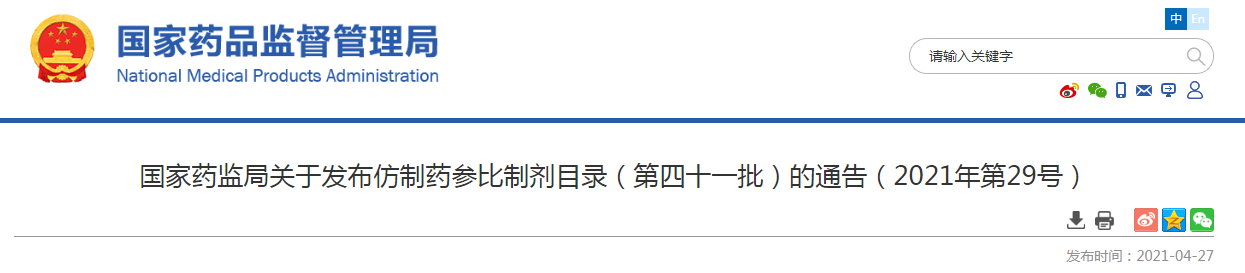 國家藥監(jiān)局關(guān)于發(fā)布仿制藥參比制劑目錄(第四十一批)的通告(2021年第29號)