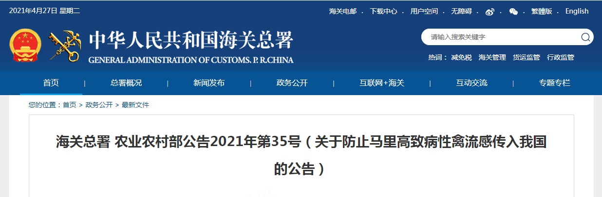 海關(guān)總署 農(nóng)業(yè)農(nóng)村部公告2021年第35號(關(guān)于防止馬里高致病性禽流感傳入我國的公告)